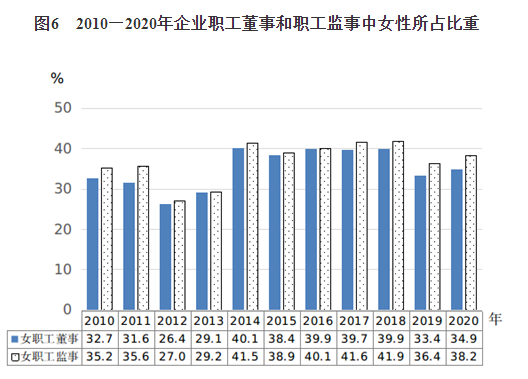 2.女性参与企业经营管理更加深入。《纲要》实施以来,我国经济社会加快发展,人们思想观念不断更新,公开、透明、择优的选拔任用机制持续完善,女性在企业管理中占据着越来越重要的地位。2020年,企业职工董事和职工监事中女性比重分别为34.9%和38.2%(见图6),分别比2010年提高2.2个和3.0个百分点。企业职工代表大会中女性代表比重[8]为30.2%,比2010年提高1.2个百分点。