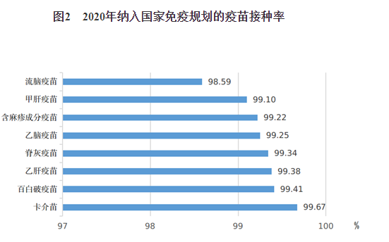2.儿童疾病防治成效显著。《纲要》实施以来,覆盖国家、省、市、县四级的免疫规划监测管理体系逐步健全,县、乡、村三级预防接种服务网络逐步建立,国家免疫规划疫苗接种率保持较高水平,儿童重点传染病得到有效控制。2020年,适龄儿童各种纳入国家免疫规划的疫苗[1]接种率均接近或超过99%(见图2)。2020年,麻疹发病率和流行性乙脑发病率分别降到0.06/10万和0.02/10万。全国新生儿破伤风发病率持续保持在1‰以下。2012年,经世界卫生组织认证,我国已实现消除新生儿破伤风的目标。