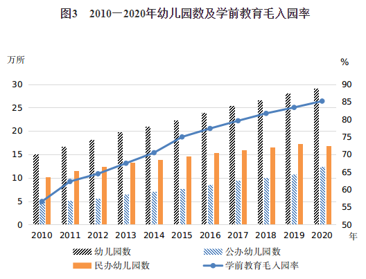 1.学前教育加快发展。《纲要》实施以来,连续实施三期学前教育行动计划,不断扩大普惠性资源供给,提升保育教育质量,目前基本建成广覆盖、保基本、有质量的学前教育公共服务体系。2020年,全国学前教育毛入园率为85.2%,比2010年提高28.6个百分点,远高于《纲要》“达到70%”的目标。全国共有幼儿园29.2万所,其中公办幼儿园12.4万所,民办幼儿园16.8万所(见图3),分别是2010年的1.9倍[2]、2.6倍和1.6倍。全国共有幼儿园专任教师291.3万人,是2010年的2.5倍。