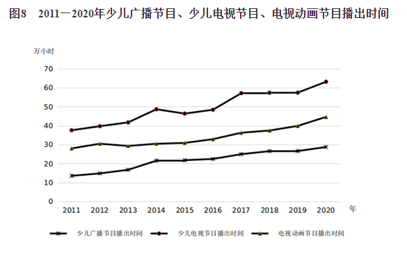 3.儿童文化产品供给日益丰富。《纲要》实施以来,面向青少年儿童的优质文化产品不断增加,青少年儿童日益增长的文化需求逐步得到满足。2020年,全国出版初中及以下少年儿童图书4.3万种9.0亿册(张),出版初中及以下少年儿童期刊209种3.3亿册。全国3212个公共图书馆共有少儿文献1.5亿册,是2011年的4.9倍。全国少儿广播节目、少儿电视节目、电视动画节目播出时间分别为28.8万小时、63.1万小时和44.6万小时(见图8),分别是2011年的2.1倍、1.7倍和1.6倍。全国未成年人参观博物馆1.2亿人次。