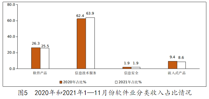 软件产品收入增速小幅回落。1—11 月份,软件产品收入 21765 亿元,同比增长 14.6%,比 1—10 月份回落 0.4 个百分点,占全行业收入的比重为 25.5%。其中,工业软件产品收入 2121 亿元,同比增长 20.1%,高出全行业水平 1.8 个百分点。