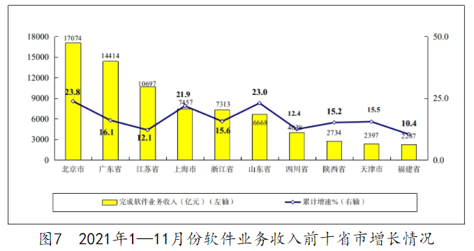 主要软件大省收入占比小幅提高。1—11 月份,软件业务收入居前 5 名的省份中,北京、广东、江苏、上海和浙江软件业务收入分别为 17074 亿元、14414 亿元、10697 亿元、7457 亿元和 7313 亿元,分别增长 23.8%、16.1%、12.1%、21.9% 和 15.6%,五省 (市) 合计软件业务收入 56955 亿元,占全国比重为 66.7%,占比较去年同期提高 0.8 个百分点。