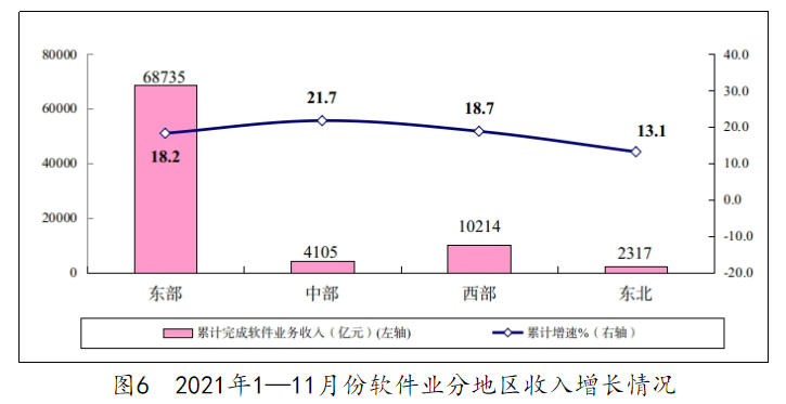 东部地区完成软件业务收入 68735 亿元,同比增长 18.2%,比 1—10 月份回落 1.2 个百分点;