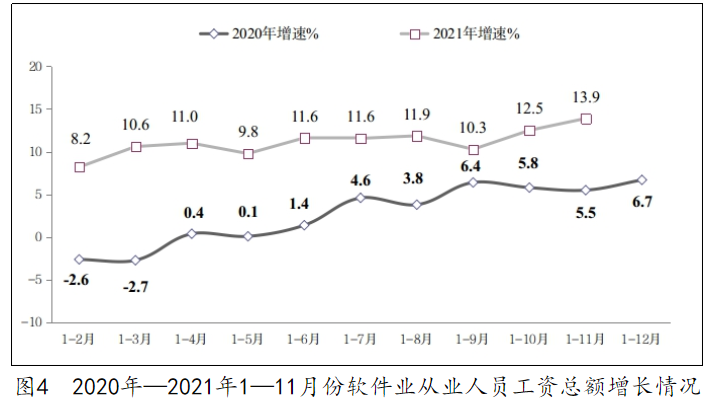 从业人员年内首次下降,工资总额加快增长。1—11 月份,我国软件业从业人员平均人数 808 万人,同比增长 7.4%,规模比 1—10 月份减少 3 万人。从业人员工资总额同比增长 13.9%,比 1—10 月份提高 1.4 个百分点,近两年复合增长率为 9.6%。