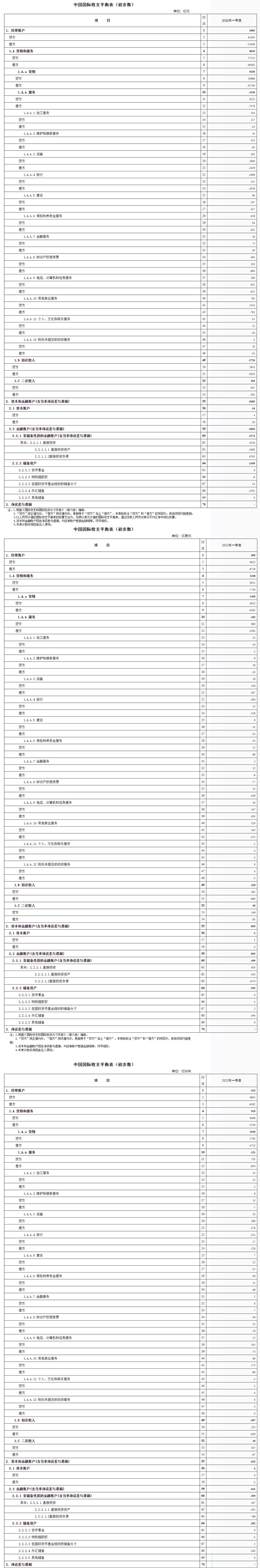 按SDR计值,2022年一季度,我国经常账户顺差643亿SDR,其中,货物贸易顺差1040亿SDR,服务贸易逆差131亿SDR,初次收入逆差307亿SDR,二次收入顺差40亿SDR。资本和金融账户中,直接投资顺差467亿SDR,储备资产增加282亿SDR。