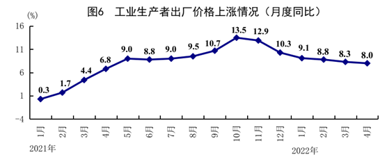 1-4月份,全国工业生产者出厂价格和购进价格同比分别上涨8.5%和11.2%。4月份,全国工业生产者出厂价格同比上涨8.0%,涨幅比上月回落0.3个百分点;环比上涨0.6%。全国工业生产者购进价格同比上涨10.8%,环比上涨1.3%。