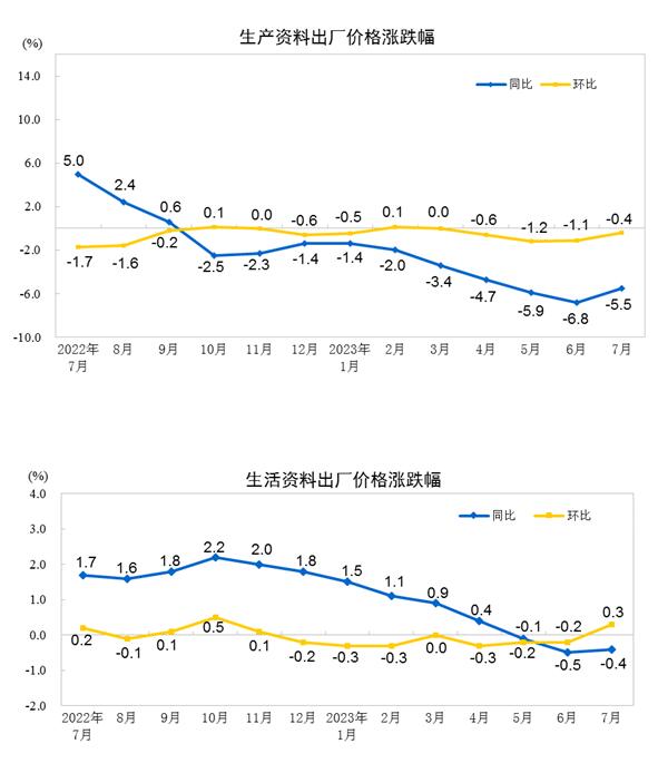 2023年7月份,全国工业生产者出厂价格同比下降4.4%,环比下降0.2%;工业生产者购进价格同比下降6.1%,环比下降0.5%。1—7月平均,工业生产者出厂价格比上年同期下降3.2%,工业生产者购进价格下降3.5%。