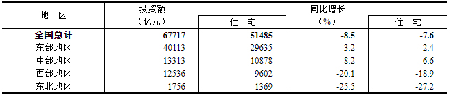 1—7月份,全国房地产开发投资67717亿元,同比下降8.5%(按可比口径计算,详见附注6);其中,住宅投资51485亿元,下降7.6%。