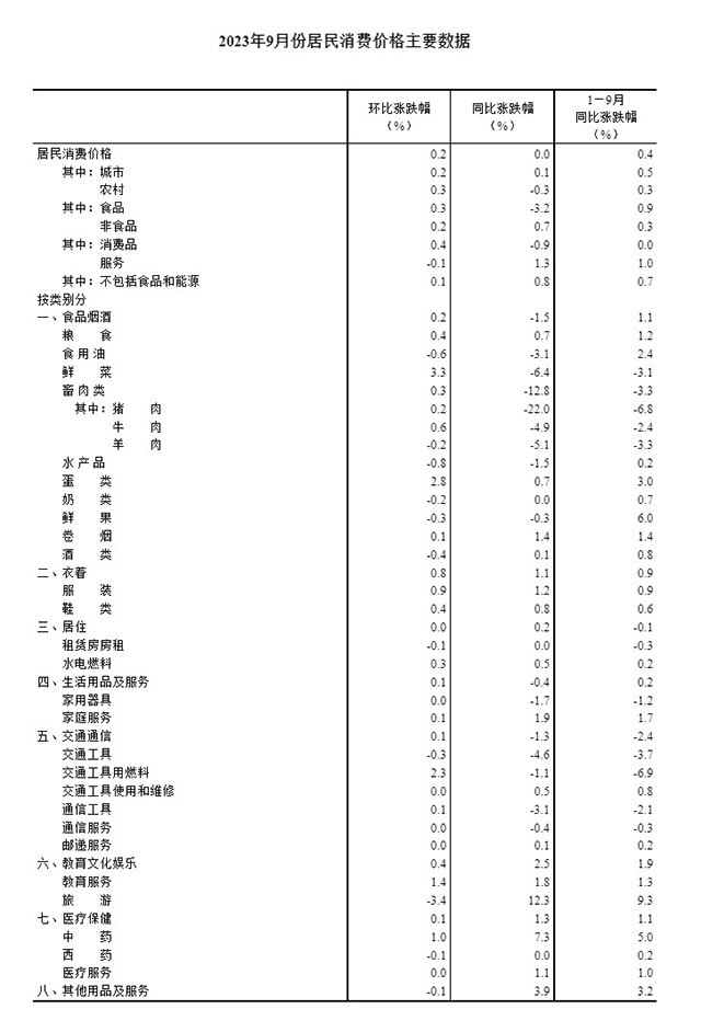 2023年9月份,全国居民消费价格同比持平。其中,城市上涨0.1%,农村下降0.3%;食品价格下降3.2%,非食品价格上涨0.7%;消费品价格下降0.9%,服务价格上涨1.3%。1--—9月平均,全国居民消费价格比上年同期上涨0.4%。