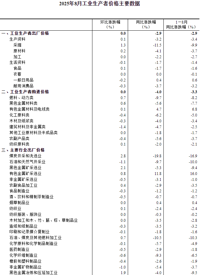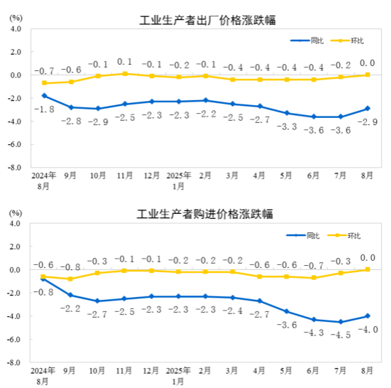 2025年8月份,全国工业生产者出厂价格同比下降2.9%,降幅比上月收窄0.7个百分点,环比由下降0.2%转为持平。工业生产者购进价格同比下降4.0%,环比持平。1—8月平均,工业生产者出厂价格比上年同期下降2.9%,工业生产者购进价格下降3.3%。
