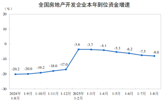 1—8月份,房地产开发企业房屋施工面积643109万平方米,同比下降9.3%。其中,住宅施工面积448460万平方米,下降9.6%。房屋新开工面积39801万平方米,下降19.5%。其中,住宅新开工面积29304万平方米,下降18.3%。房屋竣工面积27694万平方米,下降17.0%。其中,住宅竣工面积19876万平方米,下降18.5%。