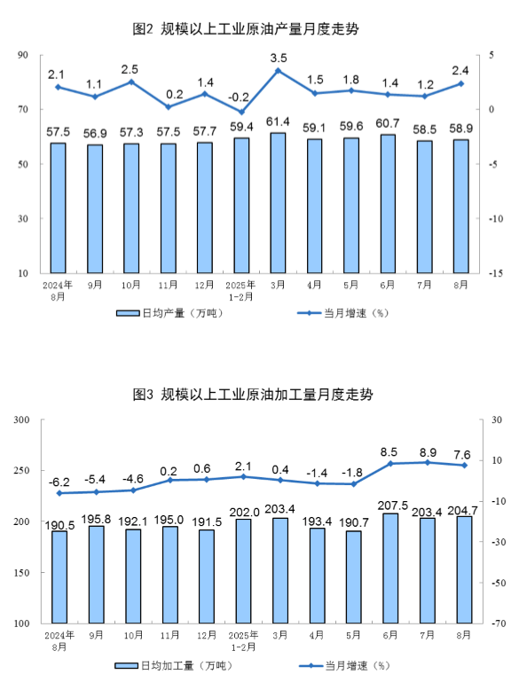 原油生产增速加快。8月份,规上工业原油产量1826万吨,同比增长2.4%,增速比7月份加快1.2个百分点;日均产量58.9万吨。