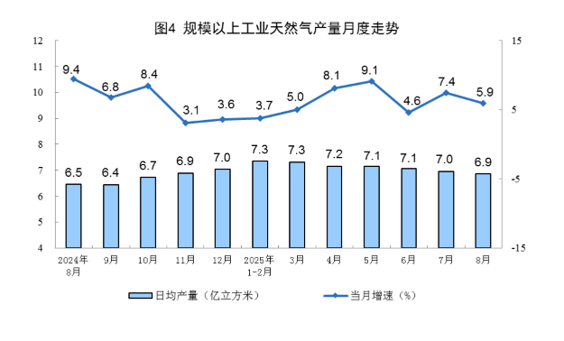 天然气生产稳定增长。8月份,规上工业天然气产量212亿立方米,同比增长5.9%;日均产量6.9亿立方米。