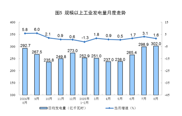 规上工业电力生产平稳增长。8月份,规上工业发电量9363亿千瓦时,同比增长1.6%;日均发电首次突破300亿千瓦时,达302.0亿千瓦时。1—8月份,规上工业发电量64193亿千瓦时,同比增长1.5%,扣除天数原因,日均发电量同比增长1.9%。