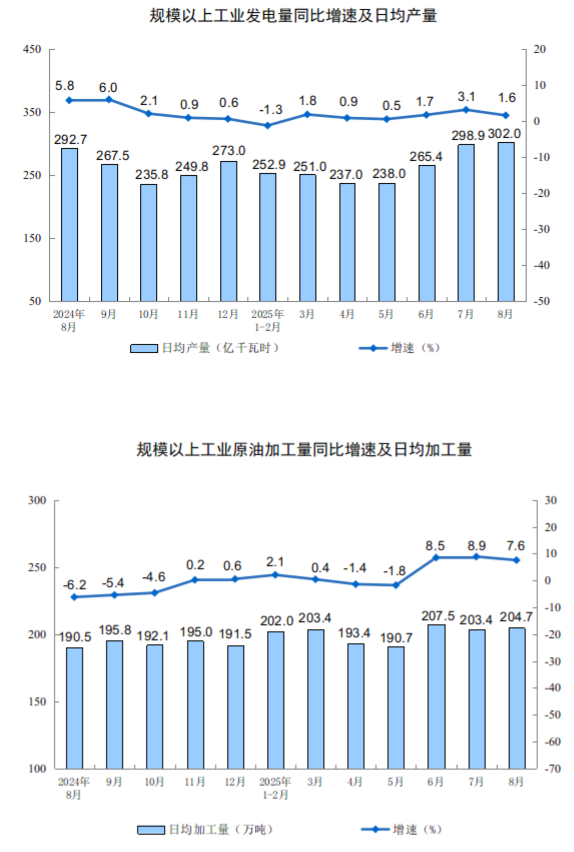 分产品看,8月份,规模以上工业623种产品中有319种产品产量同比增长。其中,钢材12277万吨,同比增长9.7%;水泥14802万吨,下降6.2%;十种有色金属698万吨,增长3.8%;乙烯314万吨,增长10.4%;汽车275.2万辆,增长10.5%,其中新能源汽车133.3万辆,增长22.7%;发电量9363亿千瓦时,增长1.6%;原油加工量6346万吨,增长7.6%。