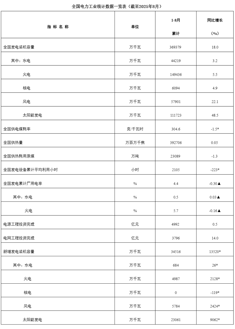 截至8月底,全国累计发电装机容量36.9亿千瓦,同比增长18.0%。其中,太阳能发电装机容量11.2亿千瓦,同比增长48.5%;风电装机容量5.8亿千瓦,同比增长22.1%。1—8月份,全国发电设备累计平均利用2105小时,比上年同期降低223小时。