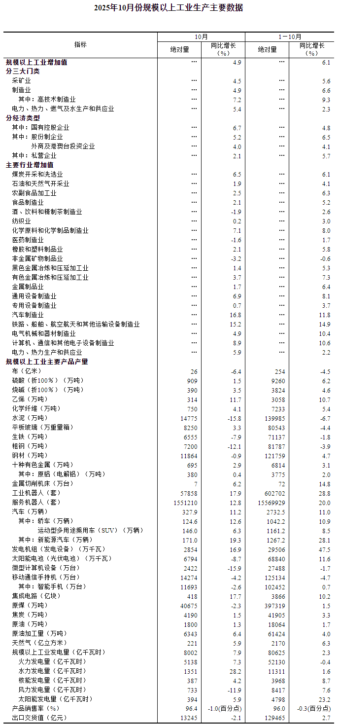 10月份,规模以上工业增加值同比实际增长4.9%(增加值增速均为扣除价格因素的实际增长率)。从环比看,10月份,规模以上工业增加值比上月增长0.17%。1—10月份,规模以上工业增加值同比增长6.1%。
