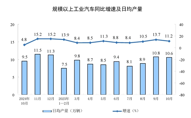 分产品看,10月份,规模以上工业623种产品中有313种产品产量同比增长。其中,钢材11864万吨,同比下降0.9%;水泥14775万吨,下降15.8%;十种有色金属695万吨,增长2.9%;乙烯314万吨,增长11.7%;汽车327.9万辆,增长11.2%,其中新能源汽车171.0万辆,增长19.3%;发电量8002亿千瓦时,增长7.9%;原油加工量6343万吨,增长6.4%。