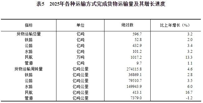 [31]货物运输总量及周转量包括铁路、公路、水路、民航和管道五种运输方式完成量,2025年增速按可比口径计算。