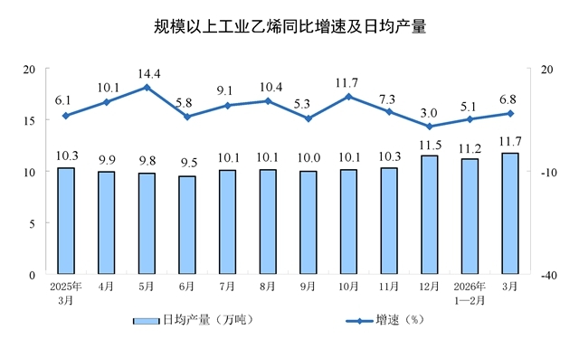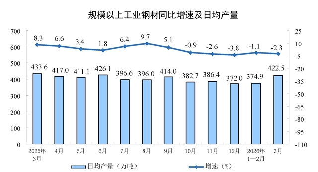 分产品看,3月份,规模以上工业626种产品中有329种产品产量同比增长。其中,钢材13098万吨,同比下降2.3%;水泥12310万吨,下降21.0%;十种有色金属707万吨,增长2.2%;乙烯364万吨,增长6.8%;汽车306.7万辆,下降0.1%,其中新能源汽车133.6万辆,增长1.2%;发电量8025亿千瓦时,增长1.4%;原油加工量6167万吨,下降2.2%。