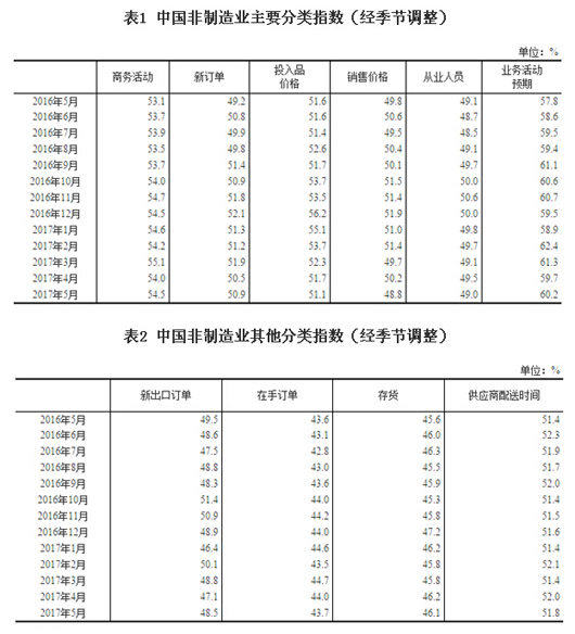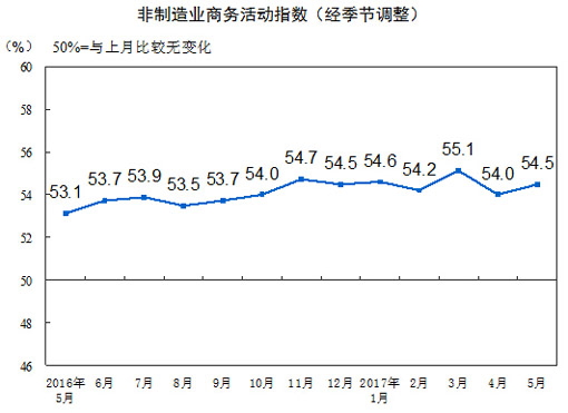 2017年5月份,中国非制造业商务活动指数为54.5%,比上月上升0.5个百分点,位于扩张区间,非制造业继续保持平稳较快的发展势头,增速有所加快。