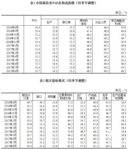 据国家统计局网站消息,2017年8月份,中国制造业采购经理指数(PMI)为51.7%,比上月上升0.3个百分点,制造业总体保持稳中向好的发展态势。