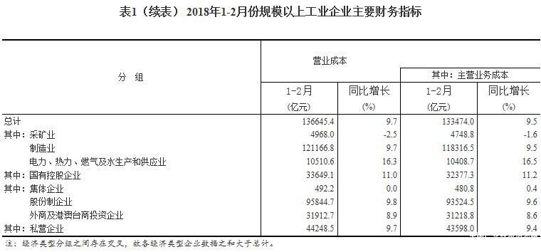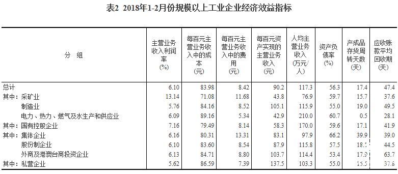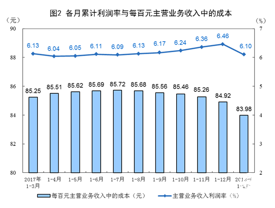 1-2月份,规模以上工业企业实现主营业务收入15.9万亿元,同比增长10%;发生主营业务成本13.3万亿元,增长9.5%;主营业务收入利润率为6.1%,同比提高0.33个百分点。