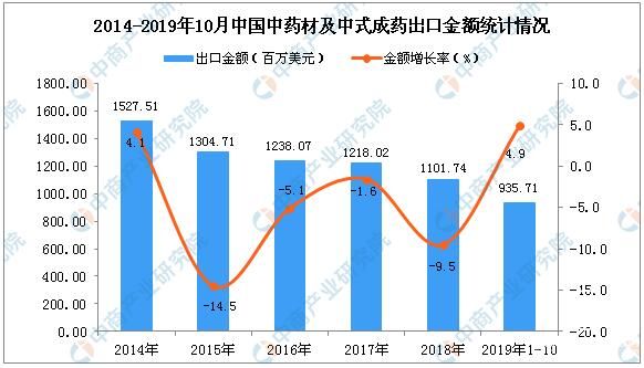 据中商产业研究院数据库显示,2019年1-3季度中国中药材及中式成药出口量有所增长,增长13.79%。2019年11月中国中药材及中式成药出口量为1.3万吨,同比增长8.3%。