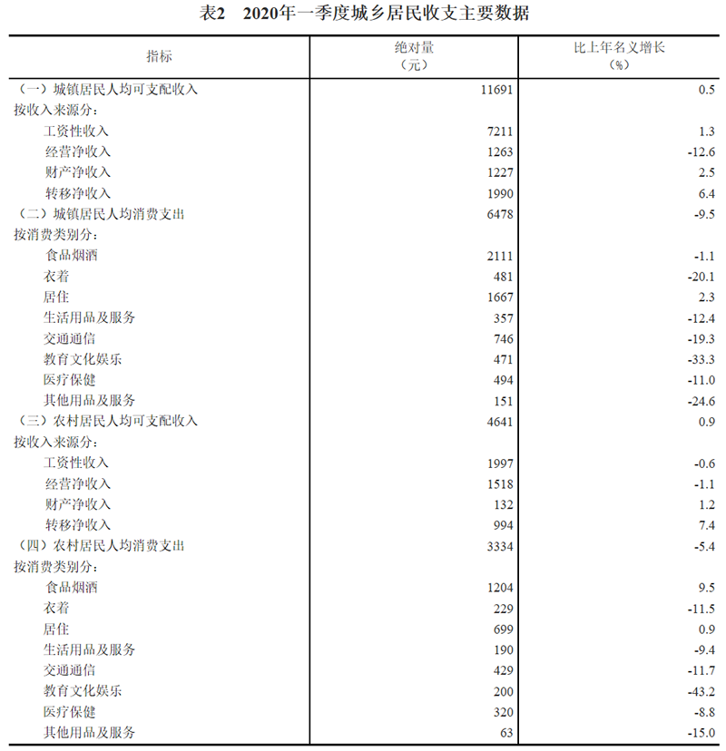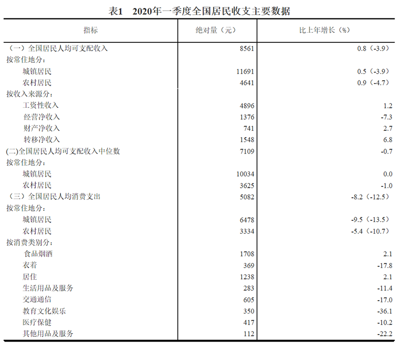 一季度,全国居民人均消费支出5082元,比上年同期名义下降8.2%,扣除价格因素,实际下降12.5%。其中,城镇居民人均消费支出6478元,下降9.5%,扣除价格因素,实际下降13.5%;农村居民人均消费支出3334元,下降5.4%,扣除价格因素,实际下降10.7%。