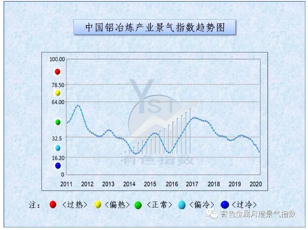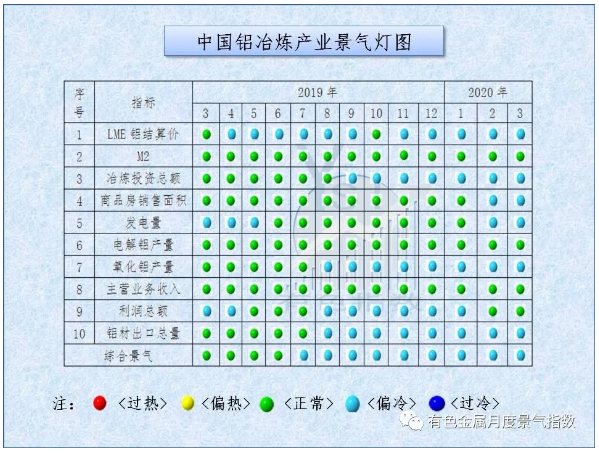 由中国铝冶炼产业景气信号灯可见,2020年3月份,在构成产业景气指数的10个指标中,LME铝结算价、铝冶炼投资总额、商品房销售面积、发电量、氧化铝产量和铝材出口总量等6个指标继续处于“偏冷”区间;M2、电解铝产量、主营业务收入和利润总额等4个指标位于“正常”区间。