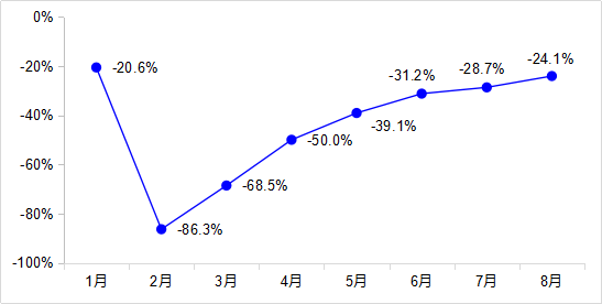 图3 2020年各月中心城市公共交通客运量同比增速变化