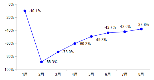 8月,完成营业性客运量9.8亿人,恢复至去年同期的62.2%,恢复程度较7月提高4.2个百分点,其中公路营业性客运量下降39.6%、水路客运量下降41.2%。