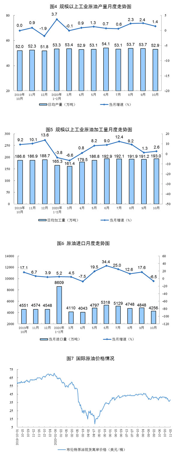 原油进口增速由正转负,国际原油价格震荡下跌。10月份,进口原油4256万吨,环比减少592万吨,同比下降6.5%,上月为增长17.6%;1—10月份,进口原油4.6亿吨,同比增长10.6%。10月30日,布伦特原油现货离岸价格为36.33美元/桶,比9月30日的40.30美元/桶下降9.9%。