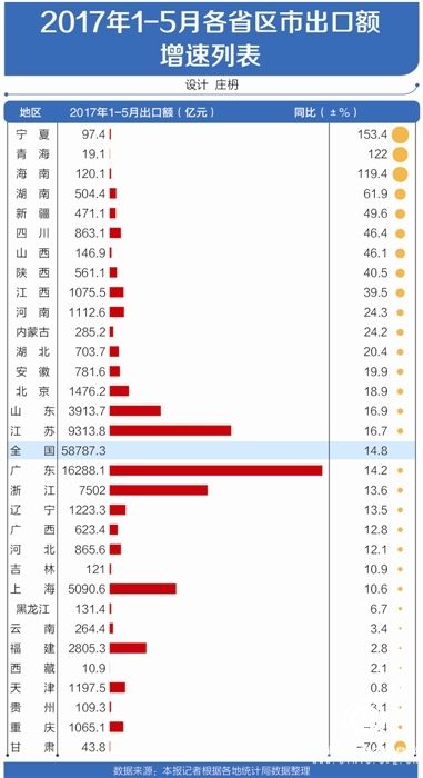 尤其值得一提的是西北地区。数据显示,2017年前5个月,各省区市出口额增速最高的为宁夏和青海,增速分别为153.4%、122%。新疆和陕西前5个月出口增速分别为49.6%、40.5%,位列为全国第五、第八。