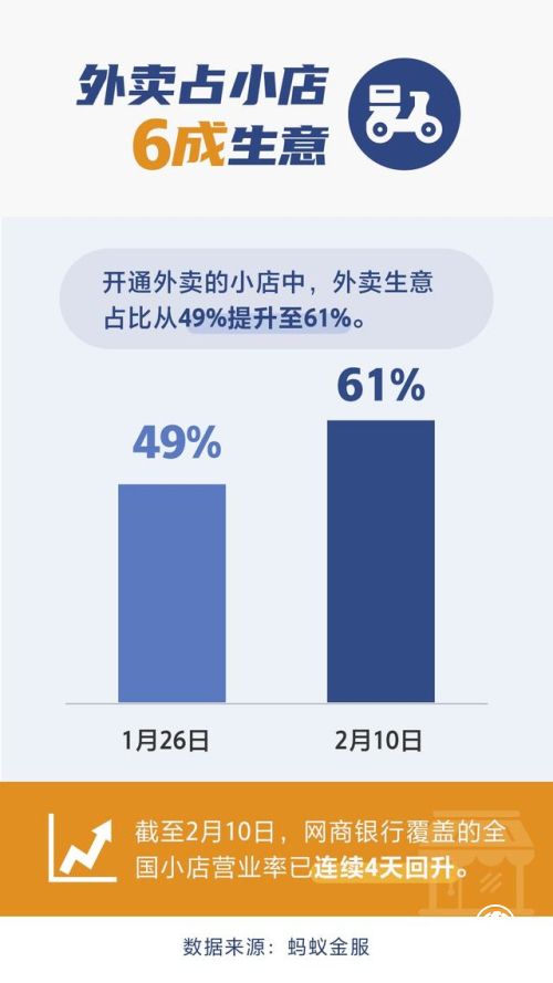 支付宝和网商银行日前公布的数据显示,疫情之下小店韧性超出预期:截至2月10日,网商银行覆盖的全国小店营业率已经连续4天回升;有贷款额度支撑的小店,开店率比大盘高出一倍;开通外卖小店中,外卖生意占比从49%提升至61%。