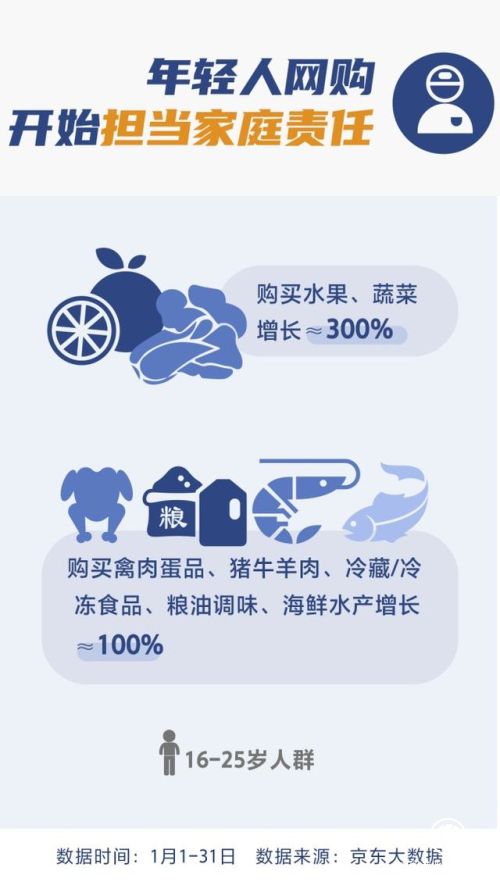 作为“互联网原住民”,“90后”“00后”对网络购物、线上订单等并不陌生。数据显示,年青一代购买肉蛋果蔬的增长最为迅猛,显示出年轻人开始承担照顾家庭的责任。