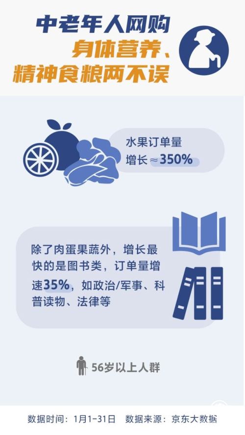 与此同时,老年人在网购方面也不落后。数据显示,56岁以上中老年人水果的订单量增长350%左右。而除了肉蛋果蔬外,增长最快的是图书类,如政治/军事、科普读物、法律等,可谓是身体营养、精神食粮两不误。