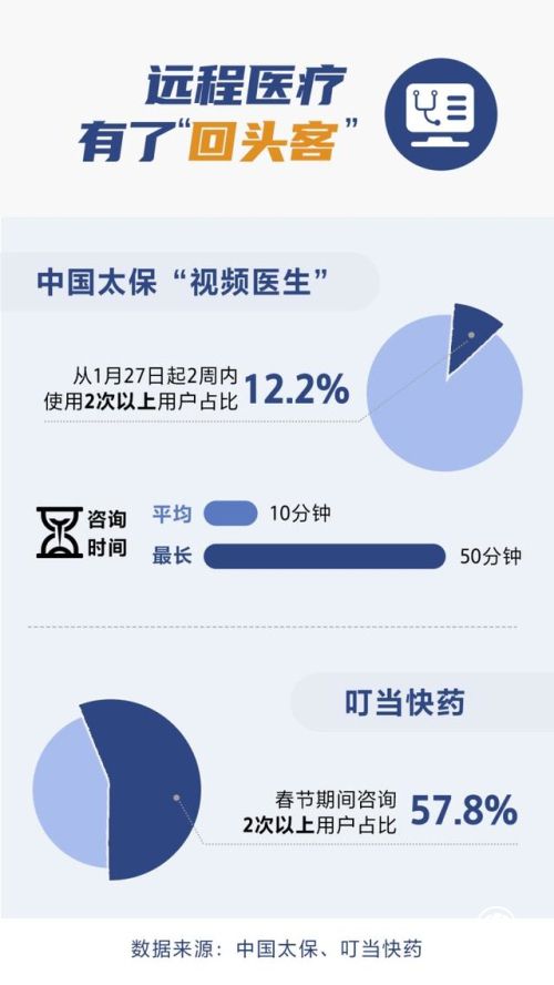随着使用人次的增长,这些远程医疗平台也开始收获一些信任。据中国太保“视频医生”数据显示,1月27日以来该平台2周内使用2次以上用户占比达12.2%,平均咨询时间10分钟,最长达50分钟;叮当快药平台春节期间咨询2次以上用户占比则达57.8%。
