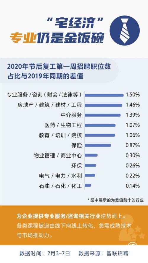 据智联招聘报告显示,春节后复工后第一周的企业招聘职位中,为企业提供专业服务/咨询相关行业逆势而上,节后第一周招聘职位数在所有行业中的占比为6.18%,较2019年同期上涨1.5个百分点,房地产/建筑/建材/工程行业招聘职位数占比也提升了1.46%。