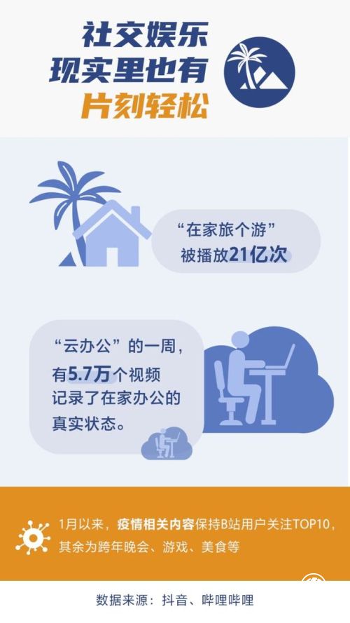 据抖音发布的2020年春节数据报告显示,抖音上有237万个视频和“不出门”有关。其中,“在家旅个游”被播放21亿次,有5.7万个视频记录了在家“云办公”的真实状态。