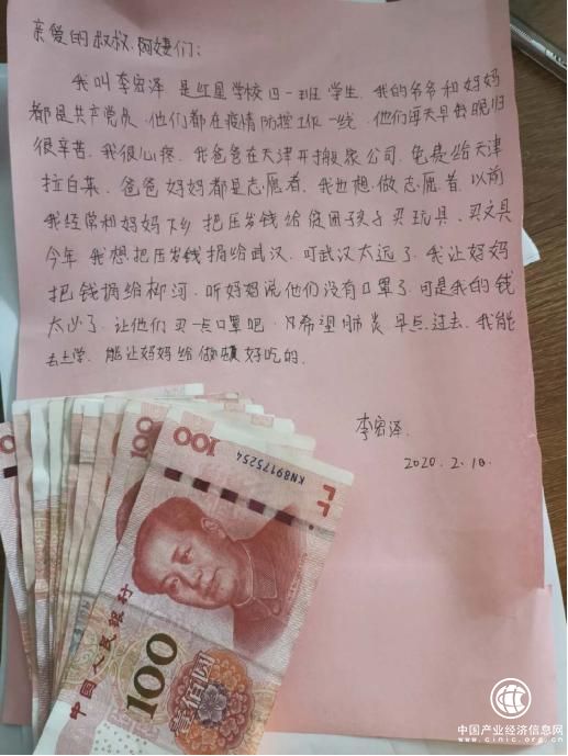 2月10日,河南省方城县红星学校四年级8岁的学生李宏泽用稚嫩的小手给坚守在家乡方城县柳河镇疫情防控一线的党员干部写了一封信,并捐献自己春节期间1000元的压岁钱。