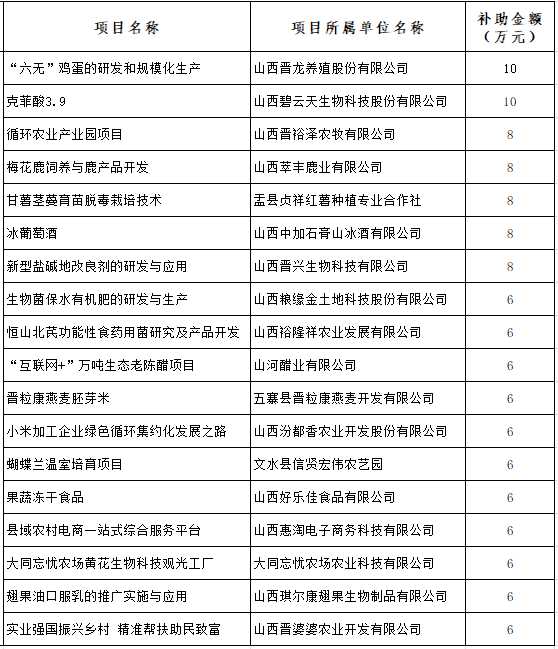 附:第四届三晋新农人创业创新竞赛获奖项目补助名单