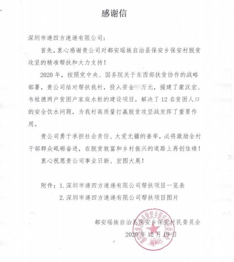 近日,深圳市递四方速递有限公司(简称递四方)收到一份来自大山深处的感谢信,广西都安瑶族自治县保安乡保安村民委员会代表当地贫困户们,就深企递四方持续以来的无私关怀以及扶贫工作深表感谢。