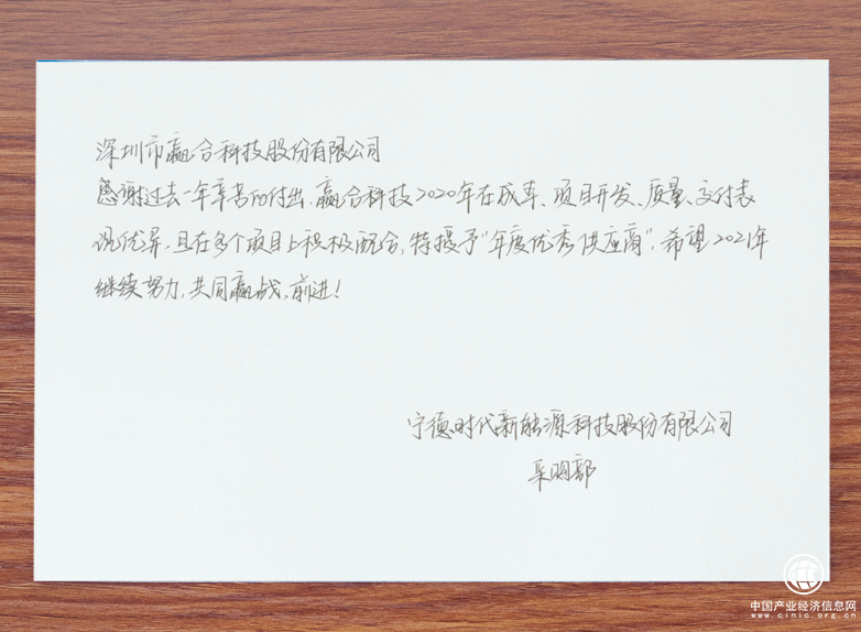 宁德时代在寄给赢合科技的感谢信中写道:“感谢过去一年辛劳的付出,赢合科技2020年在成本、项目开发、质量、交付表现优异,且在多个项目上积极配合,特别授予“年度优秀供应商”,希望2021年继续努力,共同赢战,前进!”