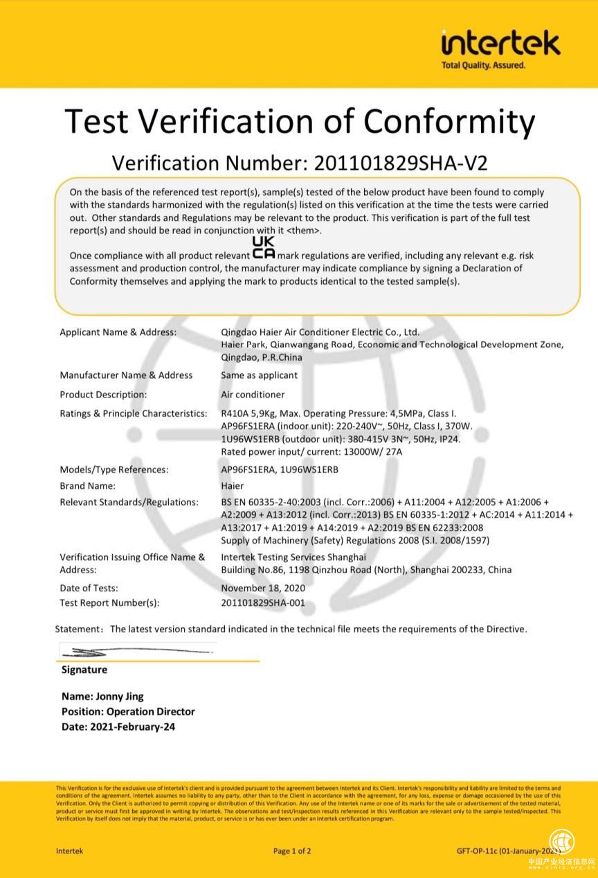 2月26日,海尔中央空调获得英国Intertek(天祥集团)颁发的全球首张商用空调英国UKCA符合性证书,这标志着该产品符合英国法规并可在英联邦市场投放销售。