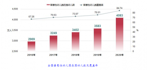 “十三五”期间,我国学前教育取得跨越式发展。教育部公布了一组数据:2020年,全国幼儿园总数达到29.17万所,在园幼儿总数达到4818.26万,与2015年相比,幼儿园数量增加了30%,在园幼儿规模增长了13%。全国学前三年毛入园率达到85.2%,增加10.2个百分点,普惠性幼儿园覆盖率达到84.74%,比2016年增加17.5个百分点。