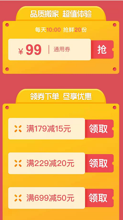 活动指南之如何使用优惠券:(1)APP:【注册并登陆自如APP】-【首页】-【搬家】;(2)微信小程序:【微信搜索“自如搬家”】进入小程序;(3)【99元无门槛】优惠券【每天10点】限量【20份】,活动期间领完即止;(4)自如搬家179-15元券、229-20元券;699-50元券,适用于自如小搬、中搬和大搬。