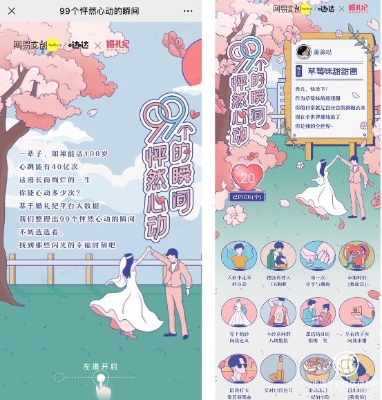 既会玩、也更懂年轻人婚礼纪将品牌态度片作为传播核心,同时为增强与用户的交互还呈现一个叫做“99个怦然心动的瞬间”有趣H5,通过易玩有趣的互动和直击心底的内容把核心主题扩散到更广的范围,以更“轻”的方式传递出品牌价值。