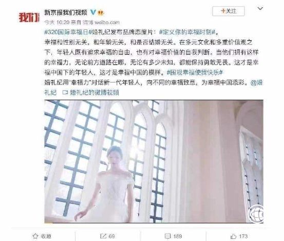 在传播渠道上,婚礼纪借助平台流量最大和质量最高的微博和朋友圈,跳出垂类媒介的传播范围,最大范围建立品牌认知,辅以主流媒体联动,凭借自媒体出圈后,与新京报“我们”视频 、中国青年网 、北京青年周刊等主流媒体合作,收获品牌认可。