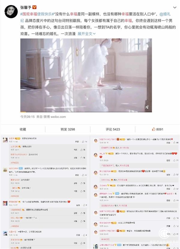 与此同时,联动明星KOL更是将传播推向高潮,而在选择合作明星上婚礼纪绝对是下了一番苦工。回归传播主题,什么样的人物形象和人物态度可以体现“幸福力”成为选择明星的关键,此时张馨予引入眼帘。张馨予作为一个对待婚姻有着清晰自我意识,且当下正处在一段幸福的婚姻的知名艺人,在事业也上保持着极高的热度,这符合品牌受众画像也为传播沉淀了流量基础。